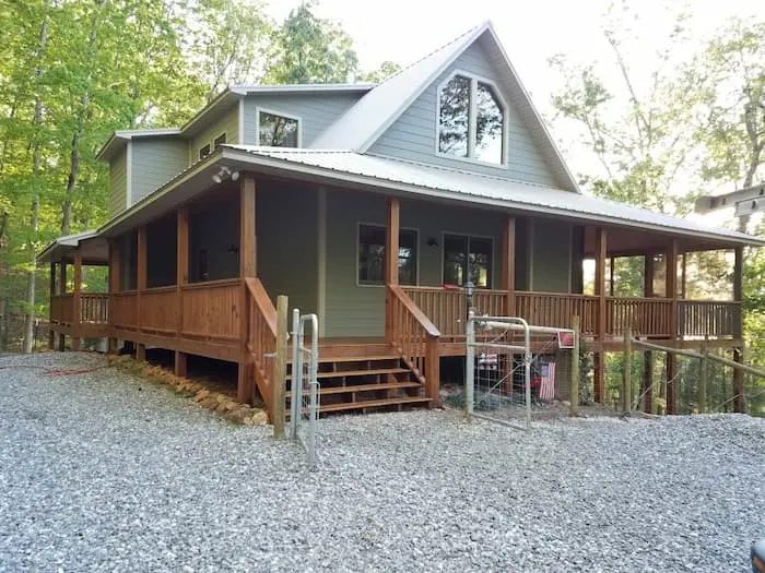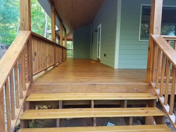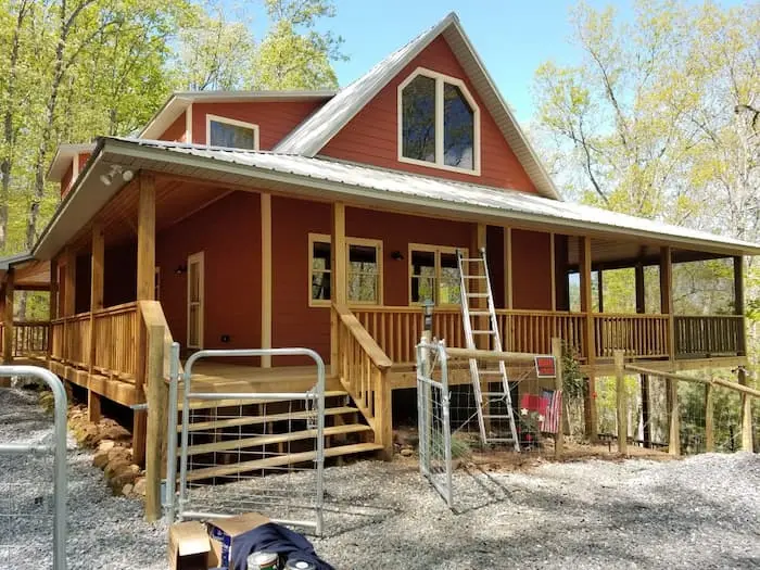 Once the decks were stained, and poly was applied to the tongue and groove ceilings ,we started prepping the the house by caulking all the cracks that were opened with 950A caulk sold by Sherwin Williams. Once the house was caulked we applied Emerald paint, to all the hardi board siding. Once the siding was painted we finalized by painting the entire trim and doors with Emerald semi-gloss paint. The final step was to scrap and clean all the windows to make sure all the over spray from the stain was removed. After the job was 100% completed, our customer was completely happy with the work we had provided and couldn’t believe how great the results were after the house was completed. If you are interested in attaining work like this for your North Georgia home, don’t hesitate to call the professionals at Lopez Painting today.